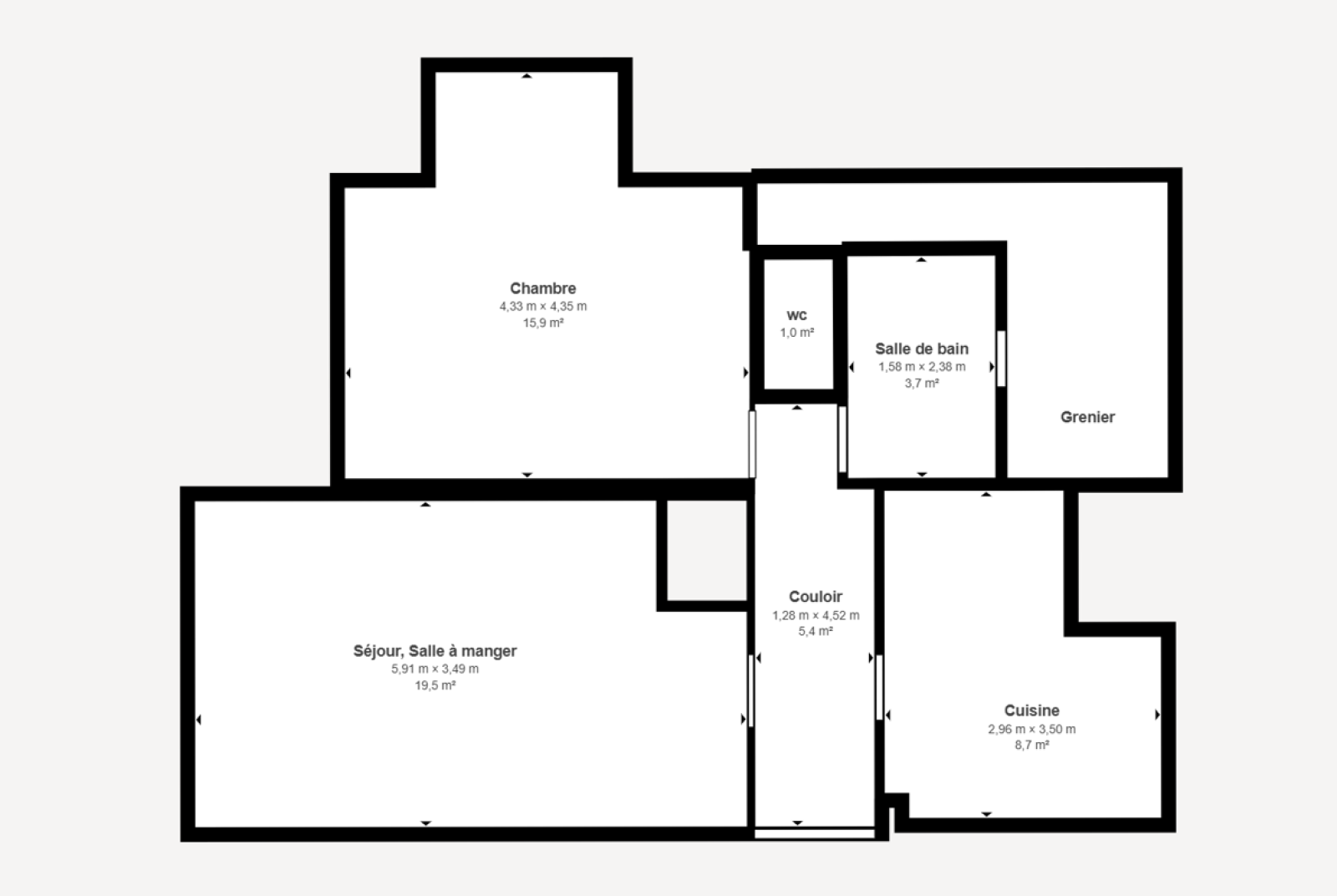 Il est composé d'une entrée, une cuisine indépendante, un séjour lumineux, une salle de bains, un WC indépendant, une grande chambre avec placard et un grand grenier attenant.